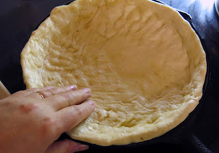 Press the dough in an oiled, seasoned 9 inch cast iron skillet. Push it