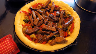 Spread the veggie mixture into the partially baked crust. Spread the cooked steak on top of that.